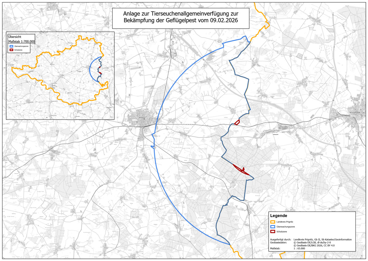 Im Zusammenhang mit dem Auftreten der Geflügelpest im Landkreis Ostprignitz-Ruppin hat auch der Landkreis Prignitz am 9. Februar 2026 eine Tierseuchenallgemeinverfügung erlassen, die am Dienstag, 10. Februar 2026, in Kraft tritt. Grund: Die Schutz- und Überwachungszone um den betroffenen Betrieb reicht in den Landkreis Prignitz hinein. Für die Halter innerhalb der Zonen wird unter anderem wieder die Aufstallung ihrer Vögel angeordnet.